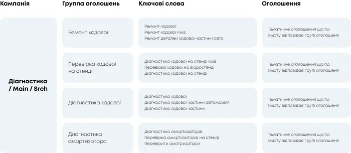 Точна сегментація аудиторії: поділ кампаній за послугами (ремонт, діагностика, заміна мастила тощо) допомагає спрямовувати рекламу на більш релевантні групи користувачів, підвищуючи ймовірність конверсій.